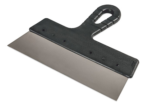 Полотно шпателя изготовлено из нержавеющей стали. Облегченная ручка из ударопрочной пластмассы. Ручка шпателя имеет специальную (изогнутую) форму, что обеспечивает максимально удобную работу. Шпатель предназначен для нанесения, выравнивания и сглаживания шпаклевочного слоя на больших и малых поверхностях.