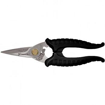 Пильный тип режущей кромки полотна обеспечивает высокую эффективность при резке и исключает выскальзывание из ножниц вырезаемого предмета. Нержавеющая сталь обеспечивает долговечность и надежность инструмента. Эргономичные рукоятки исключают выскальзывание ножниц из руки при активной работе и обеспечивают комфортность ладони при резке. Оборудован надежным замком-фиксатором для содержания ножниц в нерабочем состоянии. Оригинальный латунный крепеж рабочих полотен обеспечивает возможность регулировки зазора между рабочими полотнами ножниц. Область применения: резка многожильных кабелей из цветных металлов не более 8 мм, резка сетки из стальной проволоки диаметром не более 1 мм, любое бытовое использование