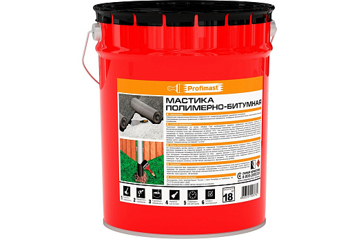 Полимерно-битумная мастика Profimast 21,5 л / 18 кг обладает клеющими свойствами, что позволяет работать с рулонными кровельными и гидроизоляционными материалами, полимерными изоляционными пленками. Незаменима для гидроизоляции бетонных поверхностей, элементов фундамента, деревянных и металлических конструкций. Продукт отличается эластичностью.