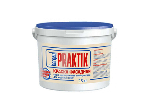 Краска Bergauf Praktik фасадная водно-дисперсионная полиакриловая предназначена для окрашивания фасадов жилых и административных зданий. Краску можно наносить на поверхности из кирпича, бетона, асбоцемента, а также внутри помещений для получения устойчивых к влажной уборке и мытью покрытий. Не рекомендована для окрашивания цоколей. Для ручного и механизированного нанесения. Краску можно колеровать в различные цвета и оттенки. Время высыхания при температуре (20±2)°С и относительной влажности воздуха (65±5) % одного слоя 0,5 ч