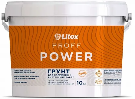 Грунт-концентрат, универсальный Литокс PROFF POWER применяется для обработки всех видов впитывающих оснований: гипсовых и цементных штукатурок, газо- и пенобетона, керамического и силикатного кирпича, керамзито- и шлакоблоков, бетонной, цементной и гипсовой стяжки и т.д.