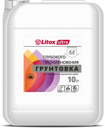 Грунтовка глубокого проникновения Литокс ULTRA - на акриловой основе, готовая к применению, используется в качестве связующего и укрепляющего рабочую поверхность состава, предназначена для высококачественного грунтования внутри и снаружи помещений по пористым, непрочным, сильно впитывающим основаниям, по ГКЛ, гипсовым, цементным и цементно-известковым штукатуркам, бетону, кирпичу с целью подготовки поверхности к покраске и перед проведением гидроизоляционных и теплоизоляционных работ.