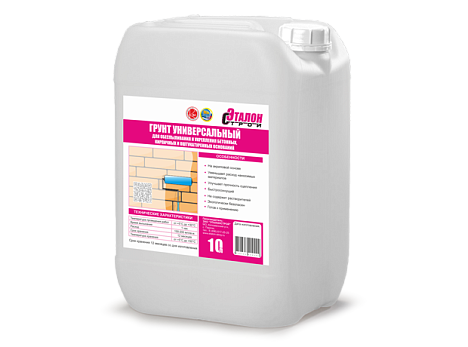 Универсальная грунтовка Эталон изготовлена на акриловой основе, грунт обеспечивает повышенное сцепление между основанием и наносимым материалом, повышает адгезию. Улучшает технологичность цементных, гипсовых, полимерных растворов, уменьшает расход краски.