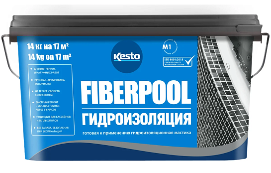 Kesto Fiberpool - готовая к применению гидроизоляционная мастика с содержанием армирующих волокон для гидроизоляции напольных и стеновых поверхностей во влажных и мокрых помещениях, а также снаружи помещений до облицовки кафельной плиткой. Применяется на объектах, постоянно подвергаемых нагрузке водой - частные бассейны внутри помещений. Не применяется для поверхностей, температура которых превышает +60 °С (напр. стены саун).