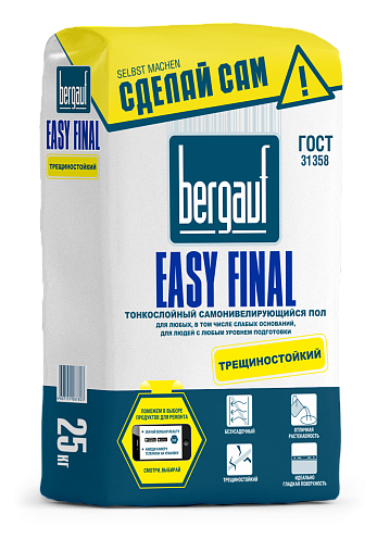 Тонкий самонивелирующийся пол на цементной основе Bergauf Easy Final для людей с любым уровнем подготовки. Создает идеально гладкую поверхность, трещиностойкий. Обладает отличной растекаемостью.