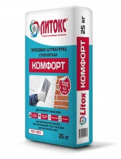 Штукатурная сухая смесь Литокс Комфорт на основе гипсового вяжущего и полимерных добавок. Предназначена для ручного оштукатуривания стен из бетона, кирпича, газобетона, пенобетона и других подготовленных поверхностей. Применяется для внутренних работ.