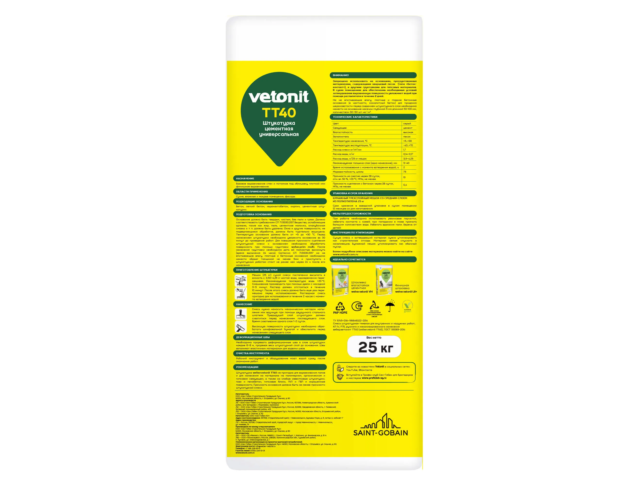 Универсальная и долговечная цементная штукатурка Ветонит ТТ 40 подходит для базового выравнивания стен и потолков в сухих, влажных и мокрых помещениях, для выравнивания фасадов зданий.