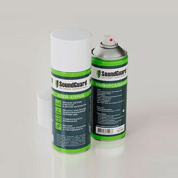 Универсальный контактный клей SoundGuard в аэрозольном баллоне предназначен для прочного склеивания плотных материалов (мембраны из резины, каучука, битума и т. п.), а также волокнистых строительных материалов (поролон, вспененный полиэтилен, полиэфирный войлок, полипропилен и т. п.) или мягких пористых материалов практически ко всем поверхностям.